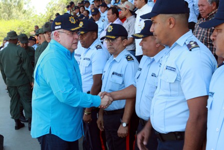 Acompañados por los voceros del consejo comunal Campo Rojo, La Maravilla, Trapichito II, Valle Verde, Manuelita Sáenz, 4 de febrero, La Mariquita y Francisca Duarte III, los efectivos de seguridad recibieron este nuevo equipamiento de manos del gobernador Rangel Gómez, ratificando con esto su plena intención de trabajar articuladamente con el pueblo para preservar la paz en las comunidades bolivarenses.