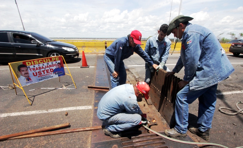 Ciudad Guayana.- La Dirección de Servicios Generales Caroní de la Gobernación del estado Bolívar y la Siderúrgica del Orinoco Alfredo Maneiro (Sidor), comprometidos con el bienestar del pueblo de Guayana, este miércoles trabajaron en la reparación de las bisagras del puente Angosturita, sentido Puerto Ordaz- San Félix.
