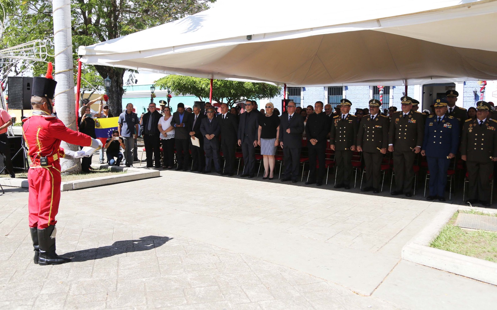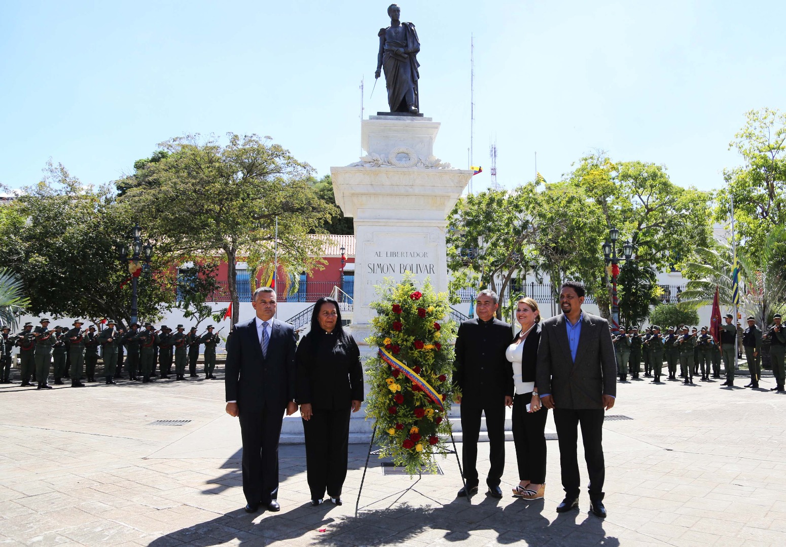 Tras rendir los honores correspondientes al mandatario regional, al Padre de la Patria Grande, General en Jefe, Libertador SimónBolívar y al líder de la revolución bolivariana, Hugo Rafael Chávez Frías, las autoridades presentes como: Sergio Hernández, Alcalde del municipio Heres, General de División, Alberto Bermúdez, comandante de la ZODI Bolívar, Mercedes Sánchez, Jueza Rectora de la Circunscripción Judicial del estado Bolívar, Orlando Alcalá, Defensor del pueblo del estado Bolívar, procedieron a colocar la ofrenda floral ante la estatua pedestre del Padre Libertador.