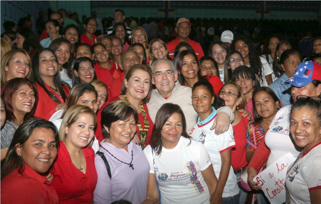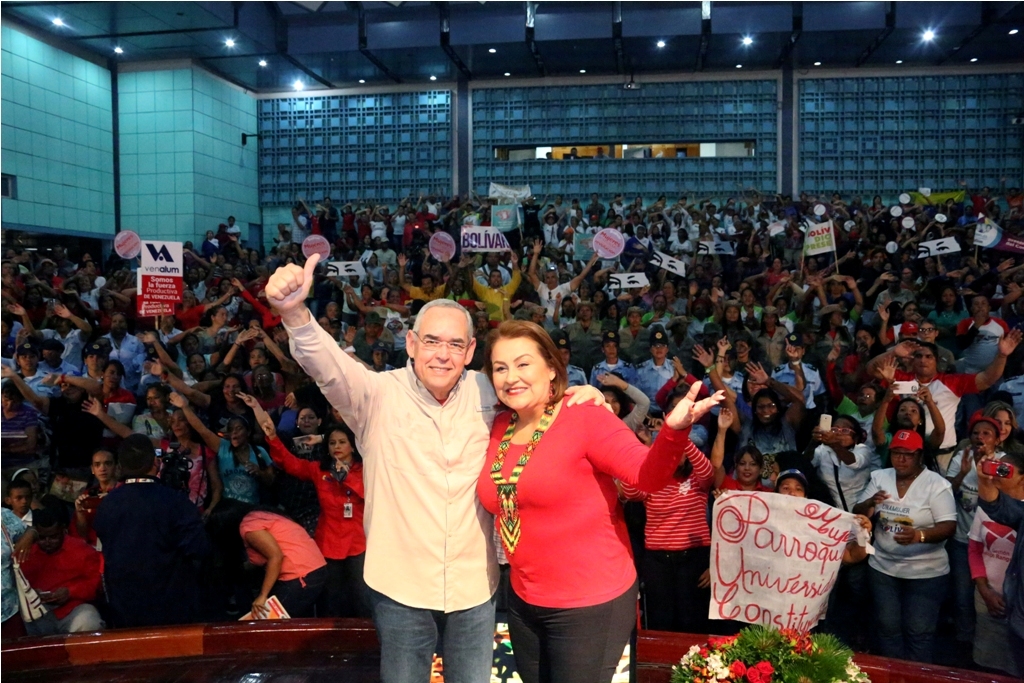 La pareja gubernamental conformada por Francisco Rangel Gómez y Nidia Escobar de Rangel, acompañados de María Alejandra Díaz, abogada constitucionalista; encabezaron el encuentro de mujeres bolivarenses por la defensa de la Asamblea Nacional Constituyente (ANC) llevado a cabo en las instalaciones del teatro de CVG Venalum, municipio Caroní, estado Bolívar.