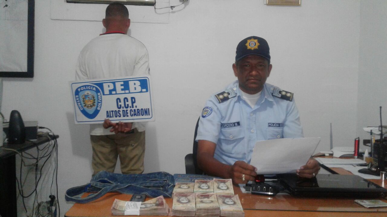 Al realizarle el chequeo corporal se le encontró en su poder una cartera de dama, color azul, la cual contenía 70 mil bolívares en billetes de cien bolívares y un teléfono celular. El facineroso quedo identificado como Eliezer Mata Evanys, de 31 años, quien fue puesto a la orden de la Fiscalía Cuarta del MP.